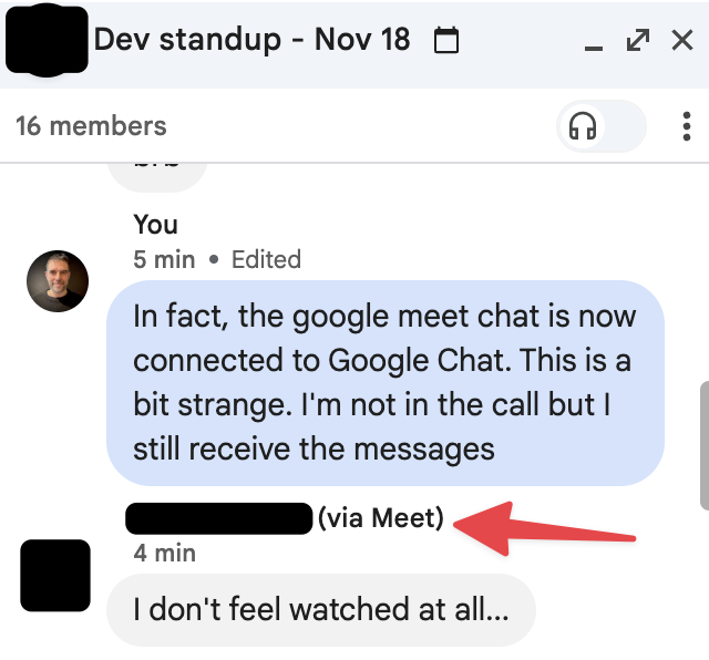 Apparently, Google connected the chat of Google Meet to Google Chat. That means that I’m now receiving chat messages from a call that I’m I’m invited to but not connected to. This is going to create awkward situations….
